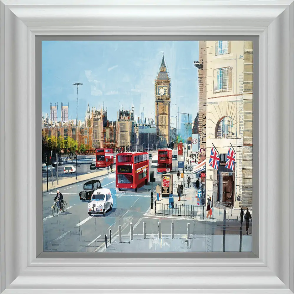 ‘Happy Chimes’, new from British collage artist Tom Butler, is a framed hand-embellished paper on board print measuring 16 x 16” and released as a limited edition of 195. The cityscape scene captures an iconic view of a bustling London street with familiar capital city landmarks like Big Ben and iconic English sights such as black cabs, red double decker buses and the ‘Union Jack’ flag. This contemporary artwork looks perfect when paired with partner piece, ‘Happy Times’.